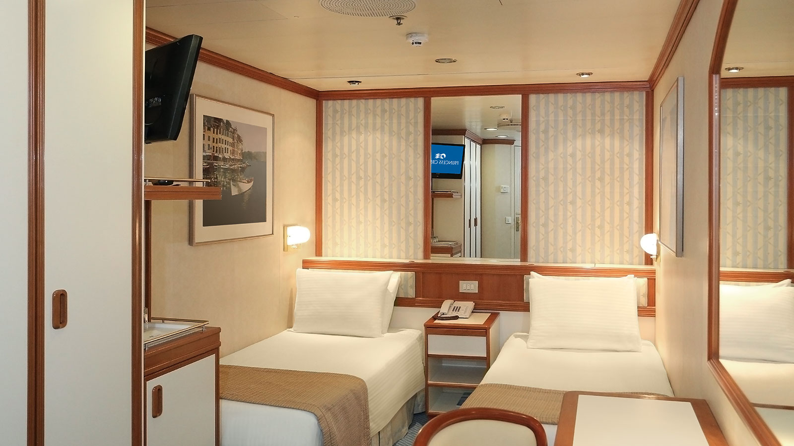 Passengers traveling in these categories of staterooms enjoy two lower beds which make up into an inviting queen-size bed. The TV, refrigerator, spacious closet and picture window add to the comfort and stylish decor. Views are obstructed in category F. The average square feet ranges from 147 to 155.