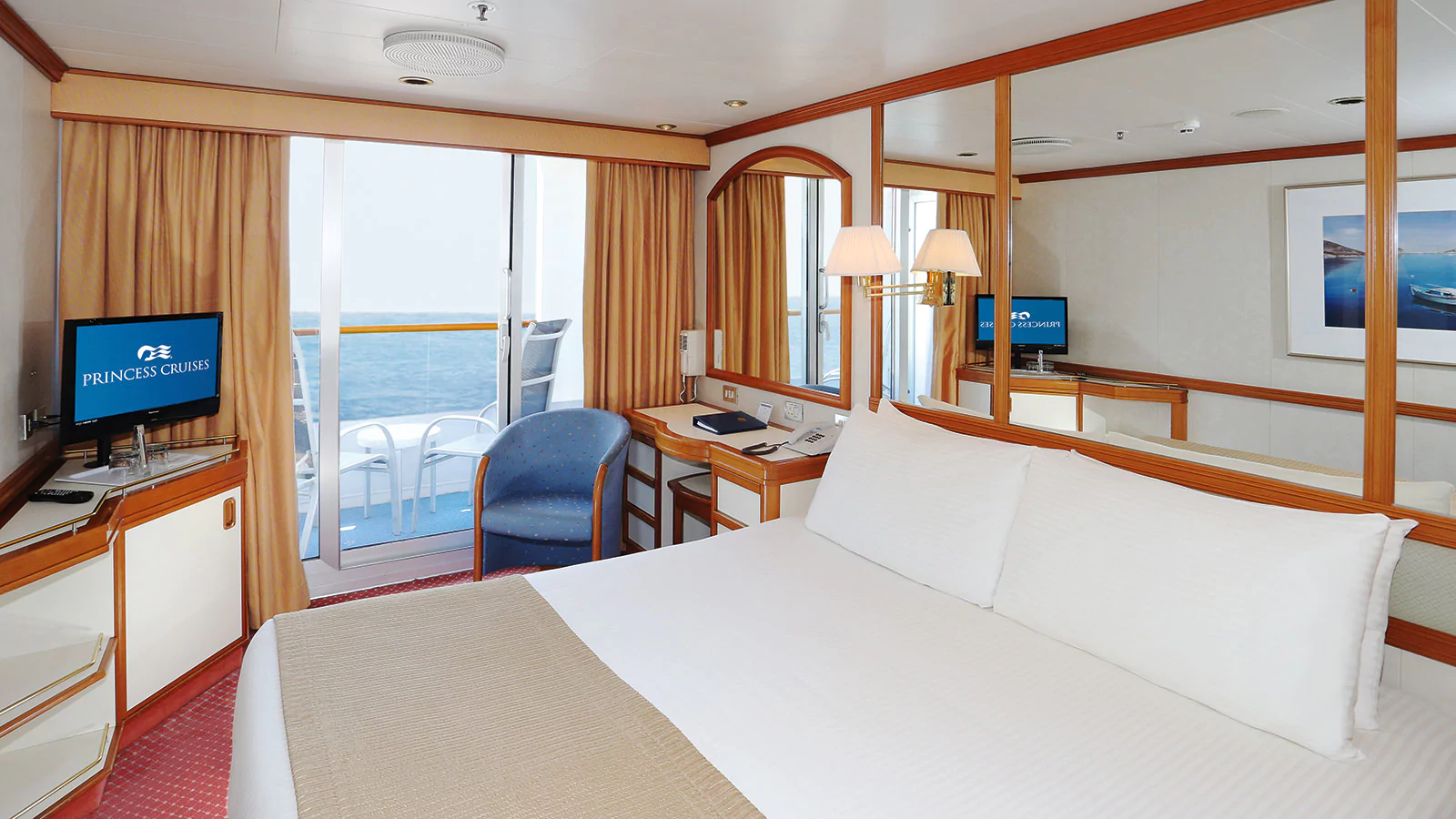 The Balcony stateroom is appointed with fine amenities such as a Balcony with patio furniture and outstanding views, twin beds that convert to a queen size bed, Private bathroom with shower with Shampoo, conditioner, body lotion, 100% Egyptian cotton linens, Satellite TV, refrigerator, hair dryer, safe, closet, phone and desk, 110V, 60-cycle alternating current (AC) with standard U.S. plug fittings and Daily housekeeping service, Evening bed turn-down and chocolates on your pillow.